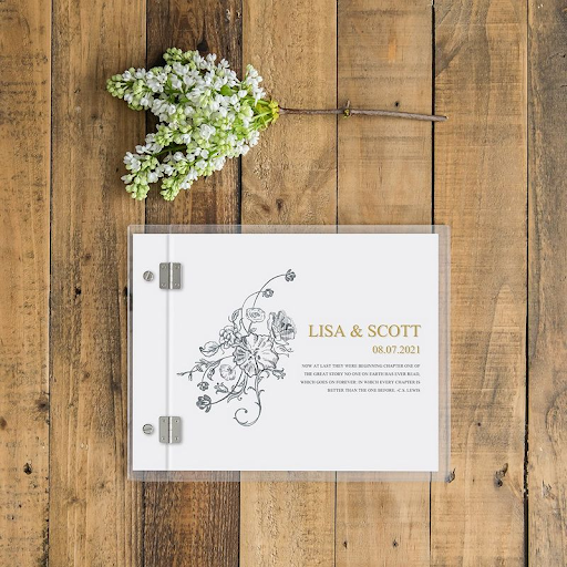 Another creative and personalized wedding guest book you can consider for your wedding is My Wedding Reception Ideas, which features an acrylic frame. It is chic, unique, and looks luxurious.