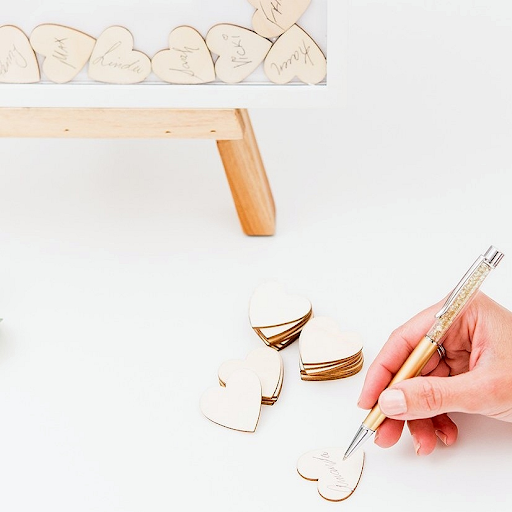 A unique wedding guest book idea you can consider for your special day is using a shadow box where guests can add signatures on wooden hearts and drop them in the box. Go one step further with this idea by getting a personalized one with your initials and wedding date on it.